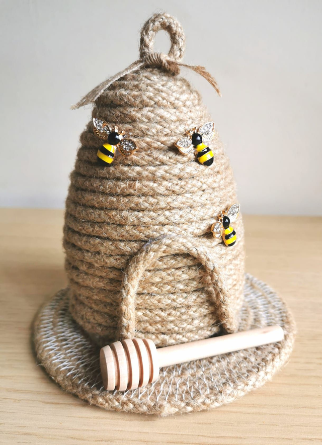 Handmade rope decorative beehive comes with a jar of Madehurst honey, wooden twizzler and a coaster. This gift set is perfect for all who love bees or honey with the advantage that it can be used afterwards as a decoration and coaster for that perfect cuppa.